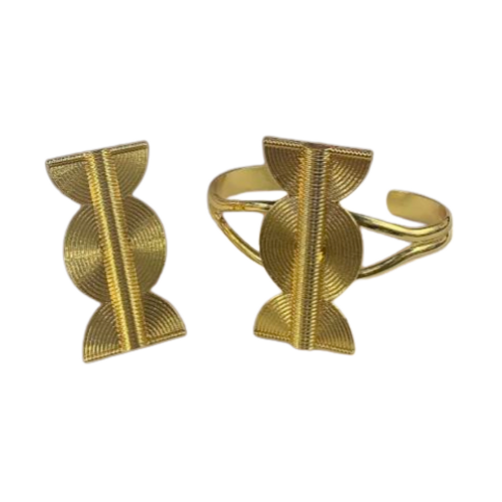 The Fulani Unity Bracelet & Ring Set is inspired by the bold gold adornments traditionally worn by Fulani women of West Africa, known for their artistry, strength, and beauty. Crafted from durable copper and luxuriously plated in 18K gold, this set features a striking geometric spiral disc design with triangular ends—a symbol of power, unity, and cultural pride.